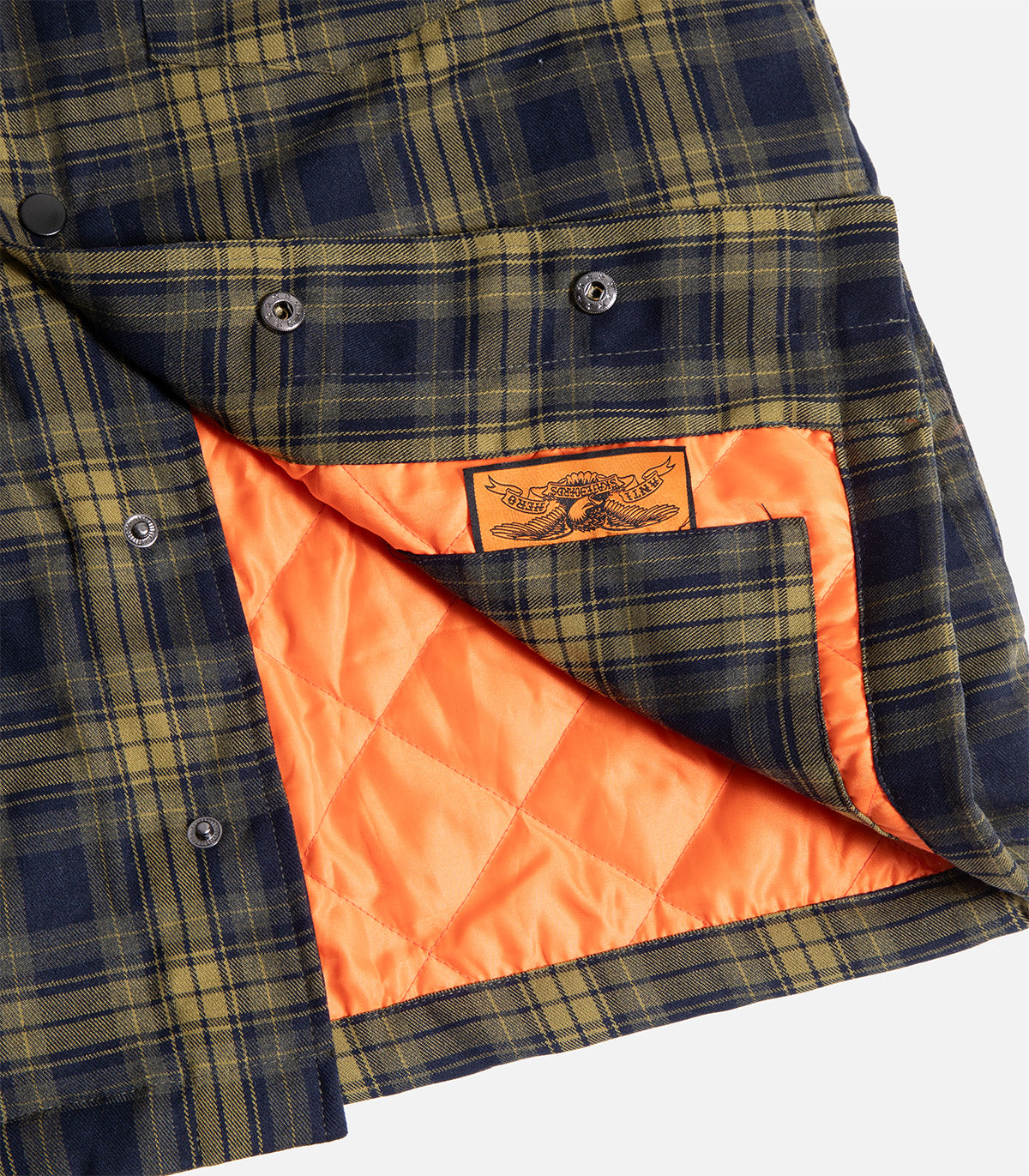 Flannel button up jacket with a quilt lining and embroidered graphic.