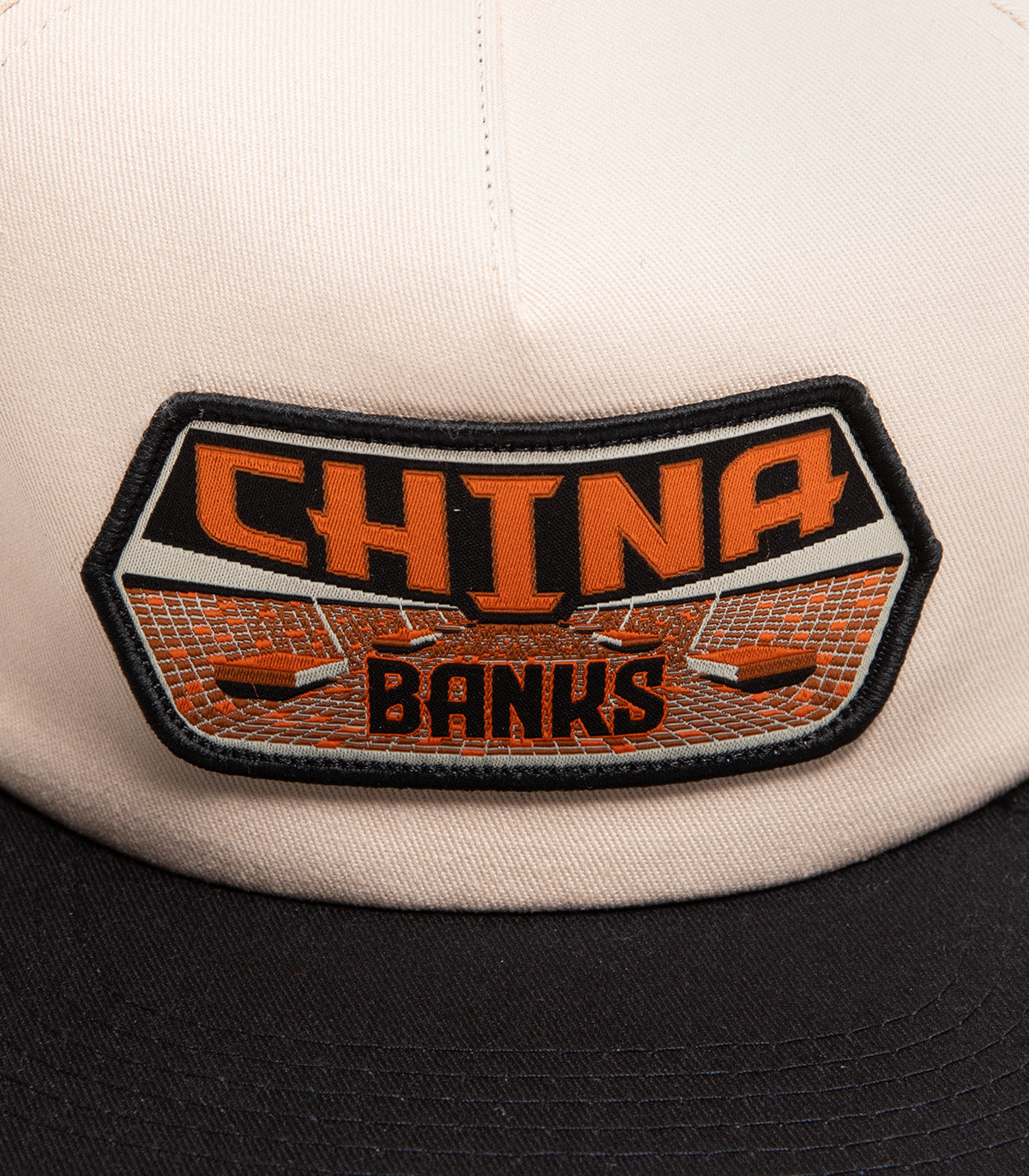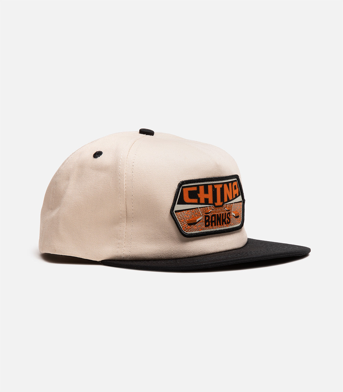 100% cotton 5 panel hat with an embroidered patch graphic and an adjustable closure.