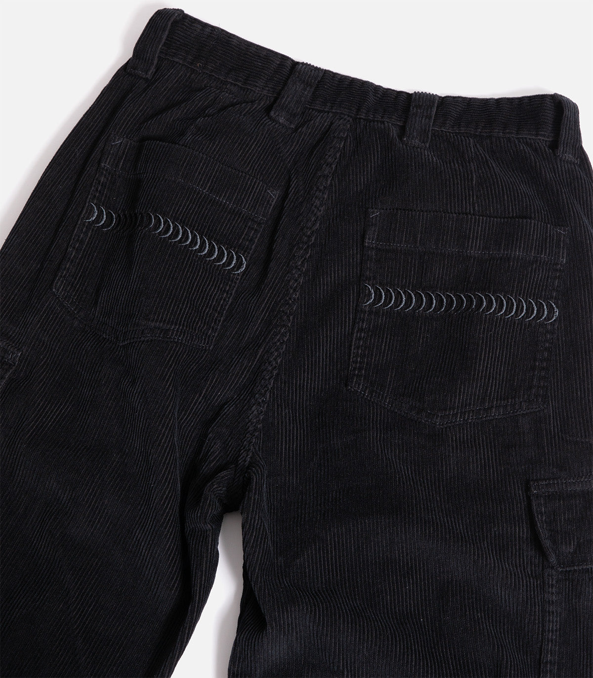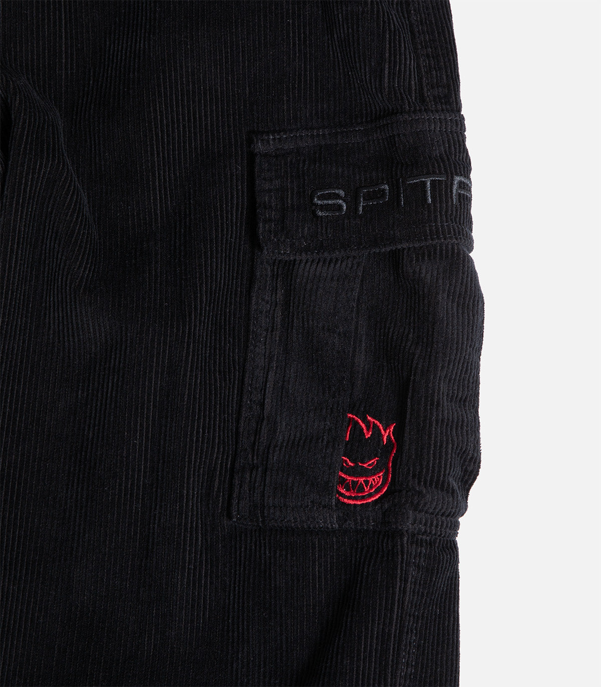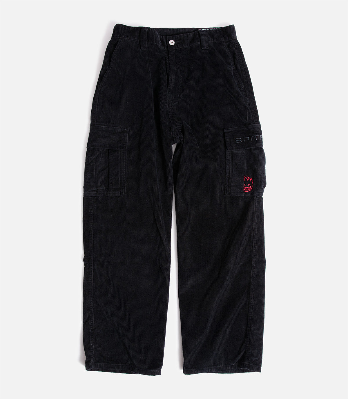 Corduroy cargo pants with a loose fit, custom Spitfire branding and custom swirls graphics on back pockets.
