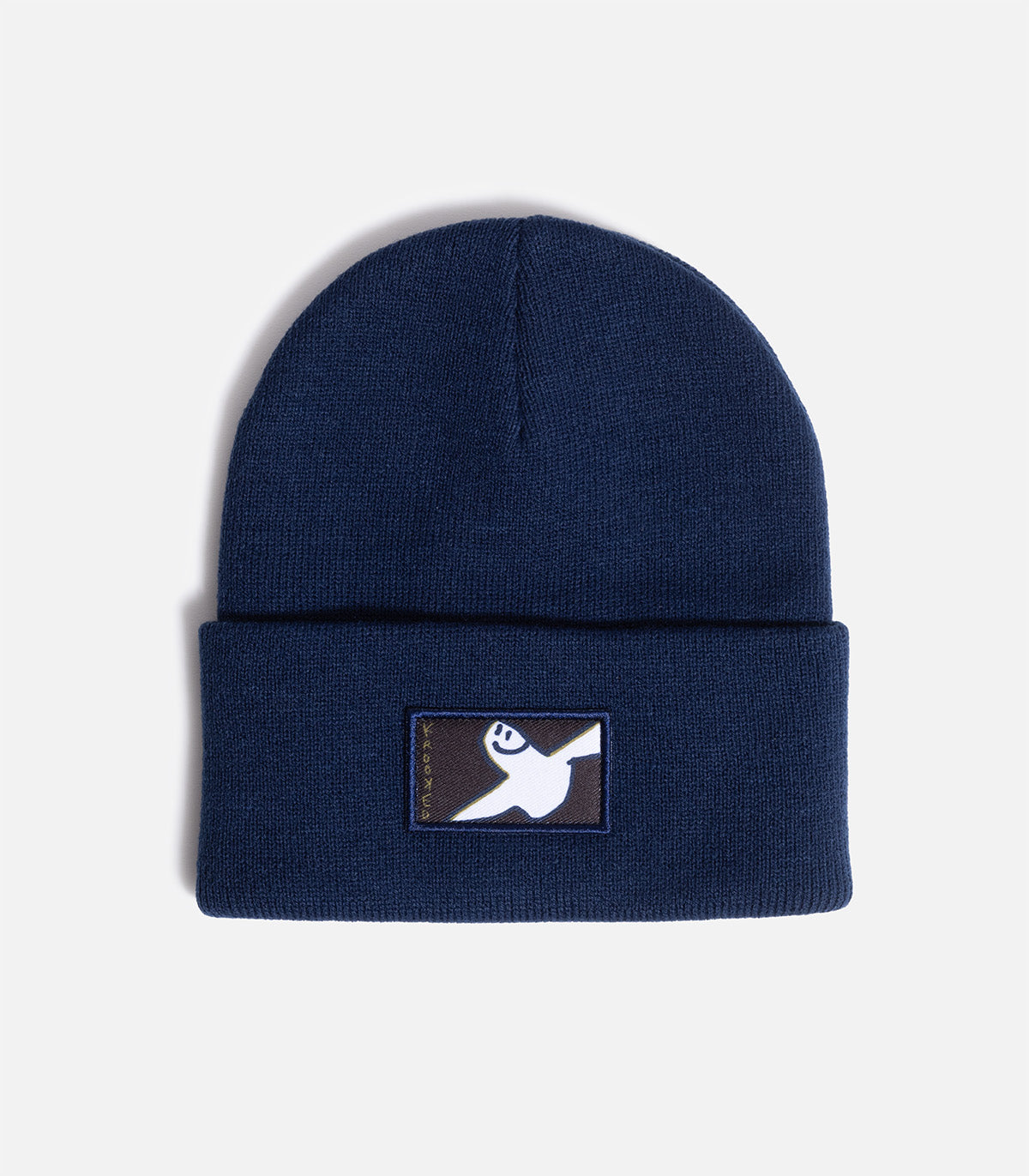 Acrylic beanie with woven patch graphic.