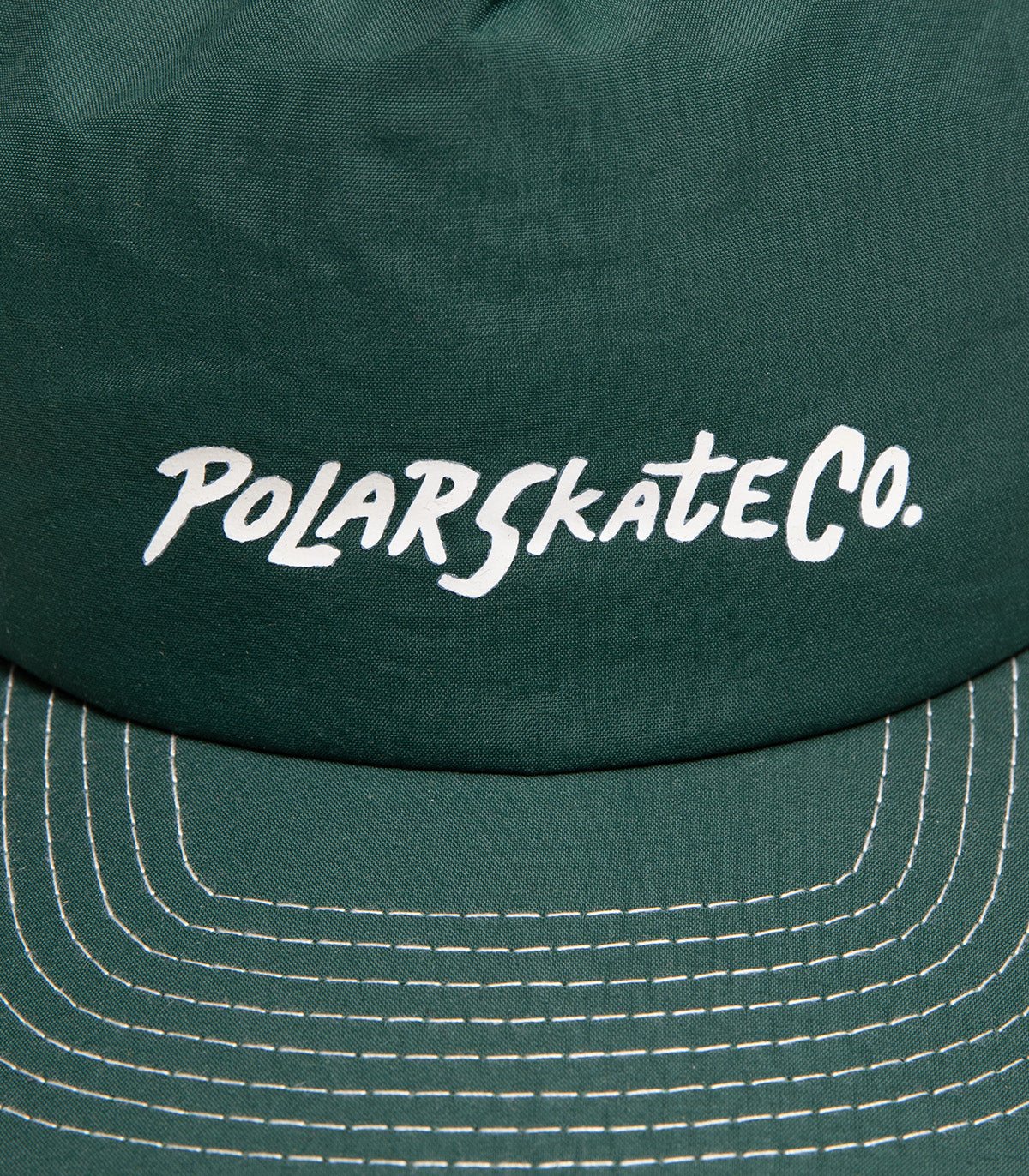 100% nylon 5 panel hat with screen printed logo and an adjustable closure.