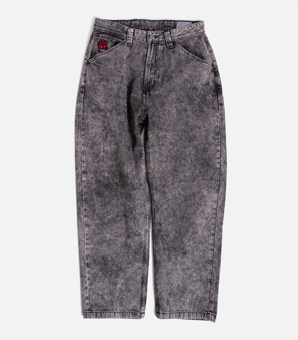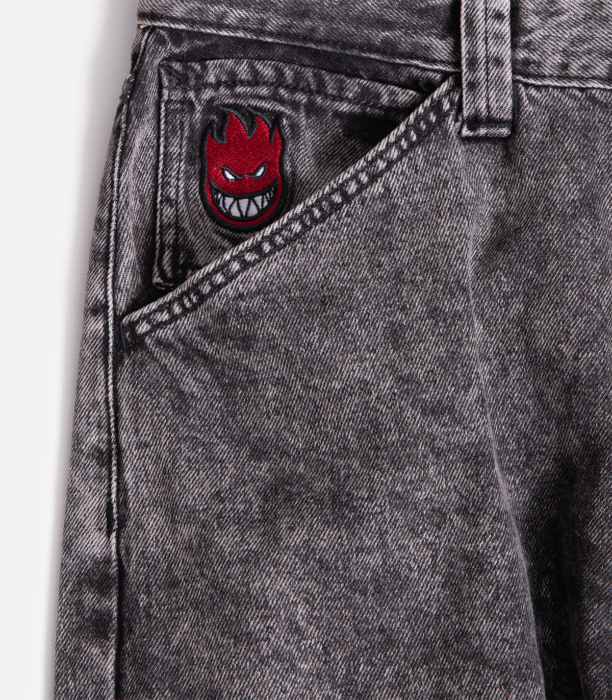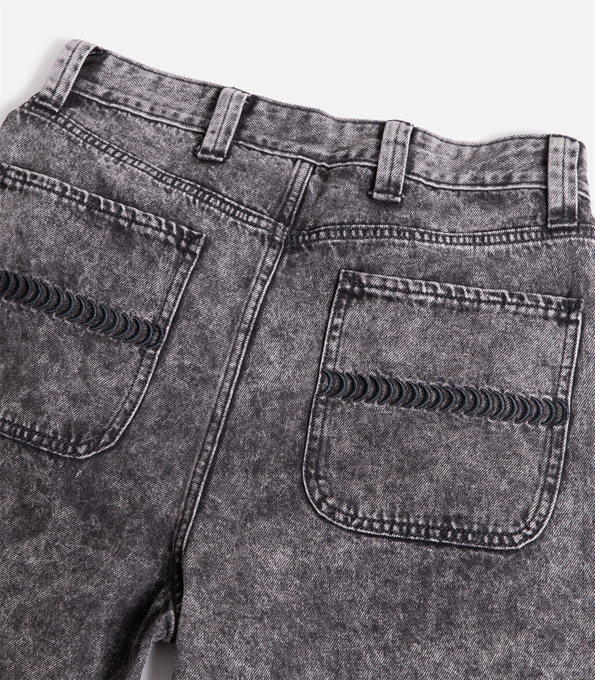 Denim pants with custom embroidery on the rear pockets and an embroidered graphic in the front right pocket.