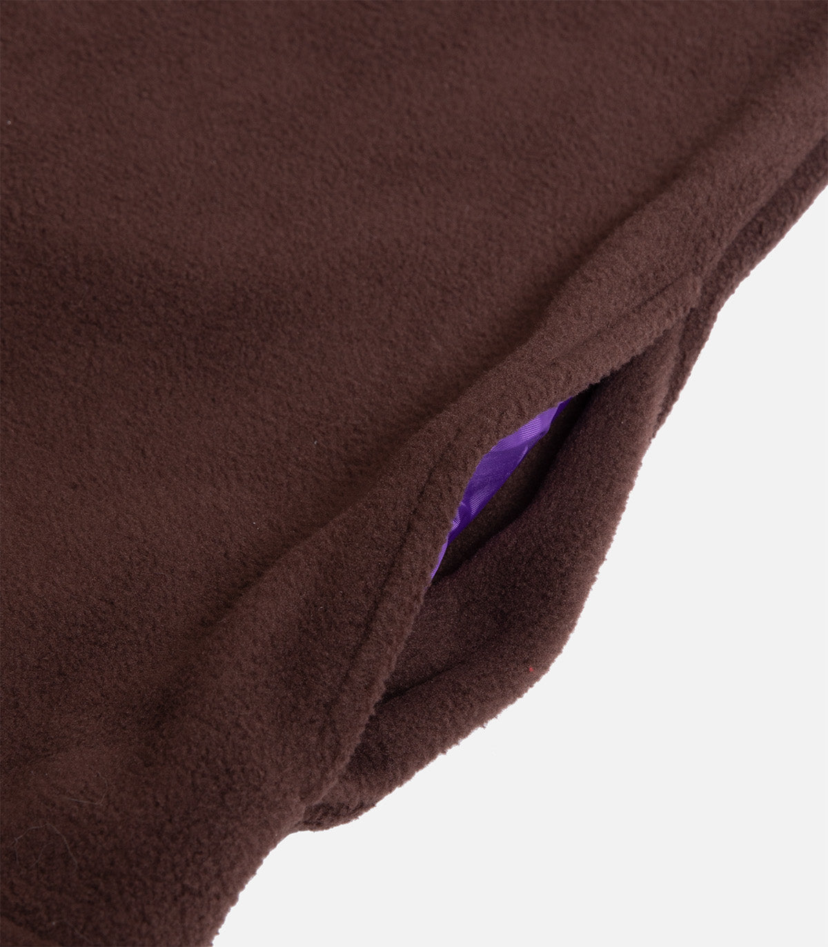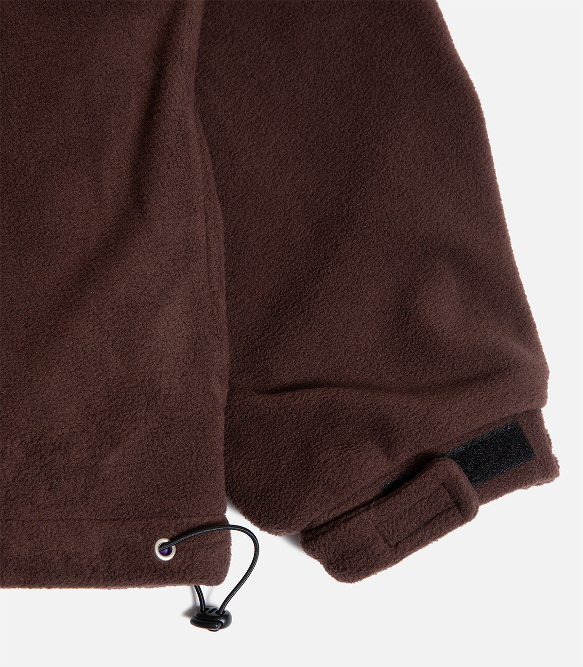 Polar fleece half-zip jacket with a front placed buttoned flap pocket, side seam pockets, embroidered logo on rear of collar, velcro adjustable sleeves and an embroidered patch graphic on front.